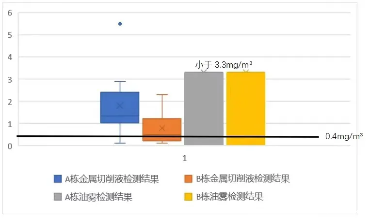 以下是我司与某检测机构对同一客户生产区域进行金属切削液与油雾暴露情况的检测数据: