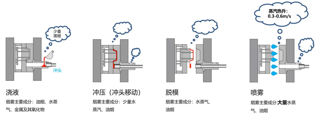压铸油烟主要在开合模与冲头区域产生,其中喷涂环节烟气流速较快(喷雾射流>1m/s),冲头区压射过程烟气流速较慢,但通常含有炭黑等高粘性颗粒物(易产生危害性黑烟)。油烟成分:主要有油雾、油烟、水蒸气、金属及其氧化物,含有粘性组分(石蜡、矿油等来自于脱模剂),粒径0.1-3μm,浓度5-60mg/m³